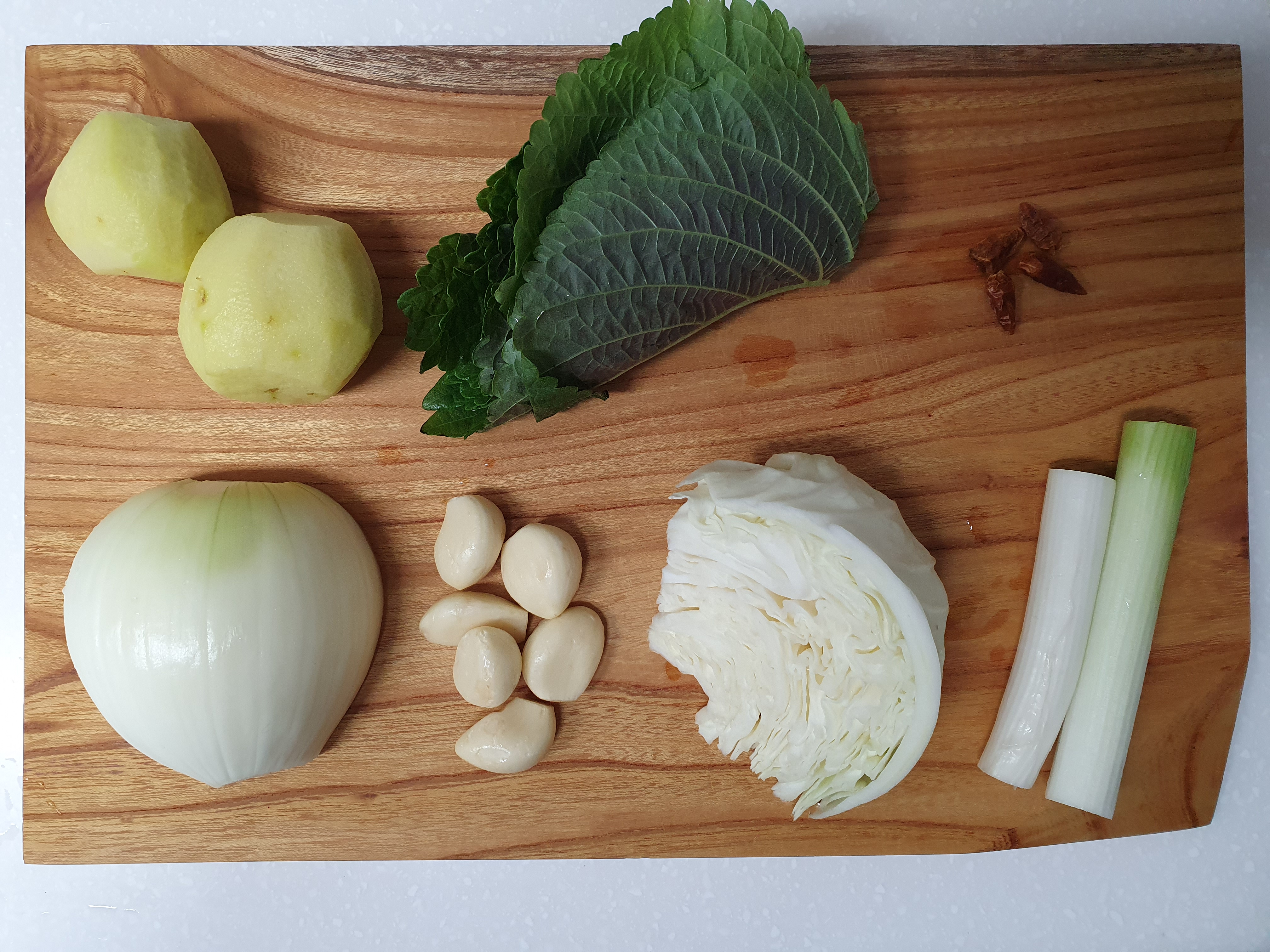 1. 양배추, 양파, 감자, 깻잎은 한입 크기로 잘라 준비해주세요. 마늘은 다지고, 대파는 어슷썰어 준비해주세요.